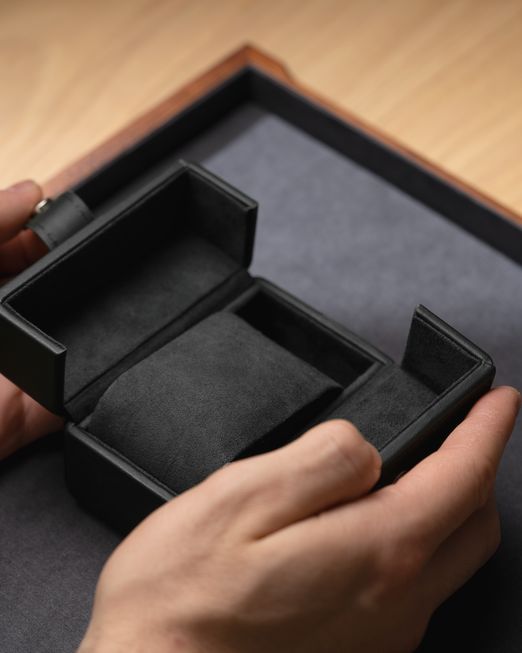 ディテールと実用性にこだわって設計されたトラベルケースは、ファーラン・マリの時計をスマートに保護。ミニマルなデザインにさりげないディテールを添え、コレクションの美学を引き立てます。日常使いにも、旅先にも対応するスタイルと機能を兼ね備えた一品です。