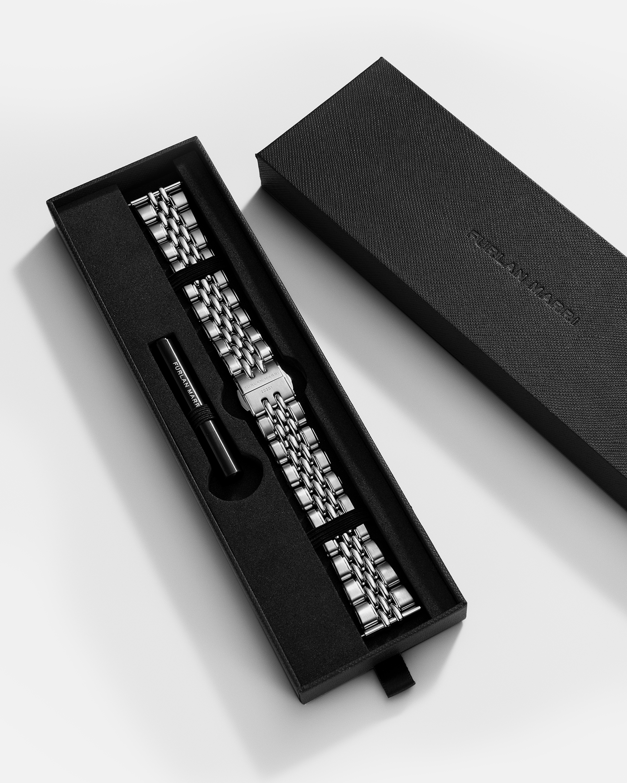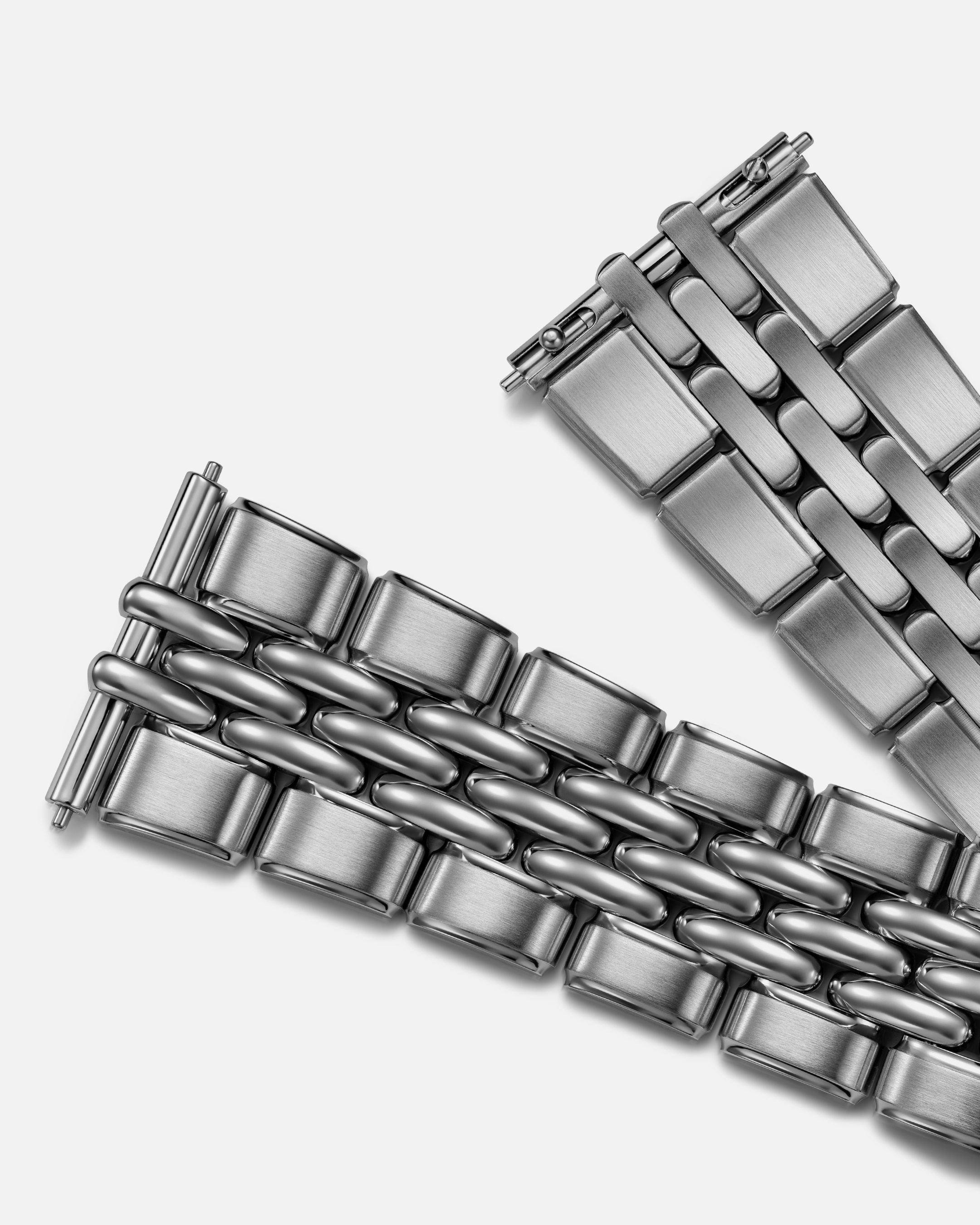 ポリッシュとサテン仕上げを組み合わせたブレスレット。エッジにはポリッシュを効かせた面取り加工が施されています。